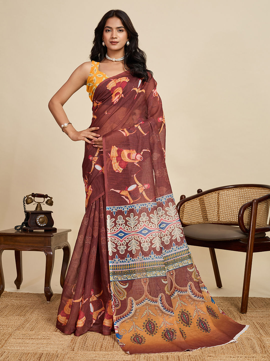 The printed green cotton-mixture saree is made from cotton and polyester, which allows it breathe well. Cotton blends preserve the form of the fabric while preventing wrinkles. For harvest events, the color green is a sign of growth and renewal. Sarees like this one with flower or geometric prints gives you more depth. For all-day relaxation during carnival activities, the fabric is perfect.